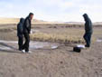 | 2006年8月,联合项目请内蒙古农大师生调查阿尔肖特湖干涸状况,做土壤分析和种草实验。远处是碱尘暴。 |